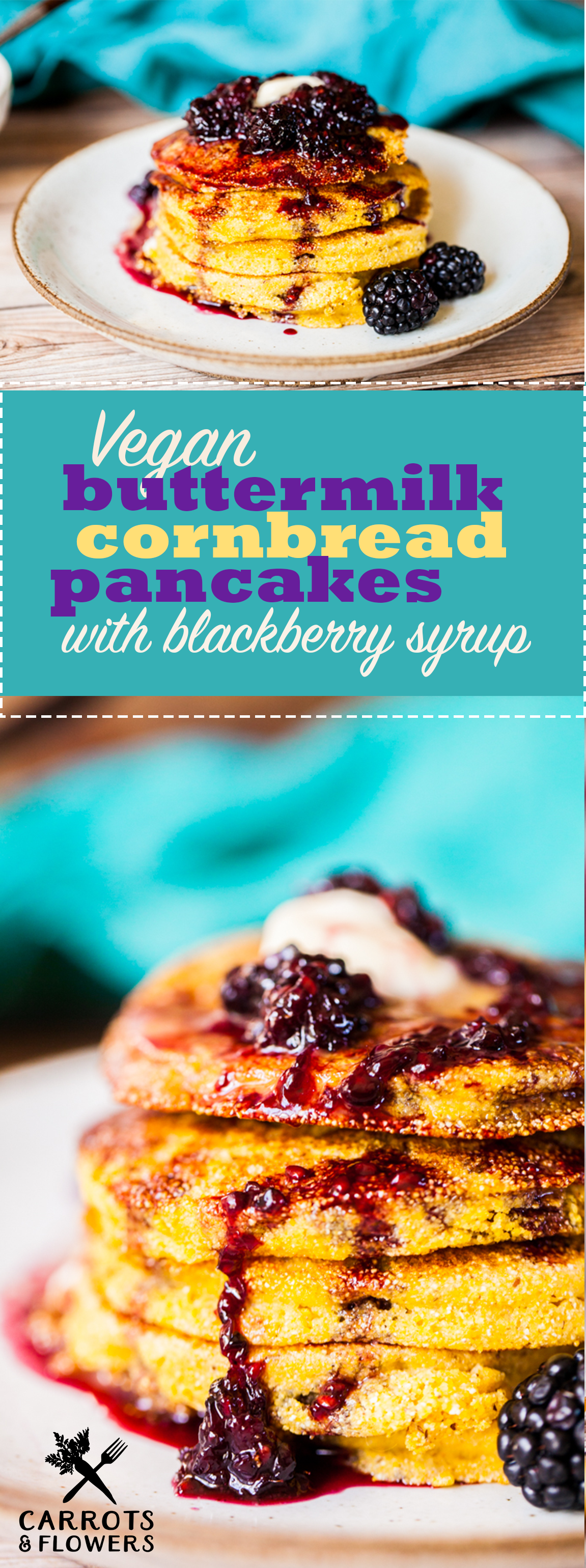 We’re talking Vegan Buttermilk Cornbread Pancakes. Topped with a chunky homemade blackberry syrup that whips up in no time.