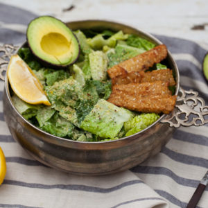 Vegan Caesar Salad with Tempeh Bacon and Hemp Seed Parmesan