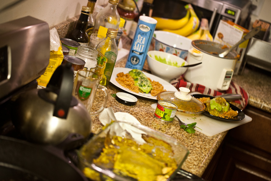 - Grease two glass cooking pans with a small amount of oil on the bottom and sides. Spread 2 tbs of green enchilada sauce on the bottom of the pan. In the center of a tortilla, spoon a dollop of mashed potatoes in the center. Top it with ½ a slice of vegan cheese, and a large scoop of the tofu filling. Carefully roll up the tortilla and place it seam side down on the pan. Sometimes the tortilla will split. To avoid this, warm your tortillas before filling them.