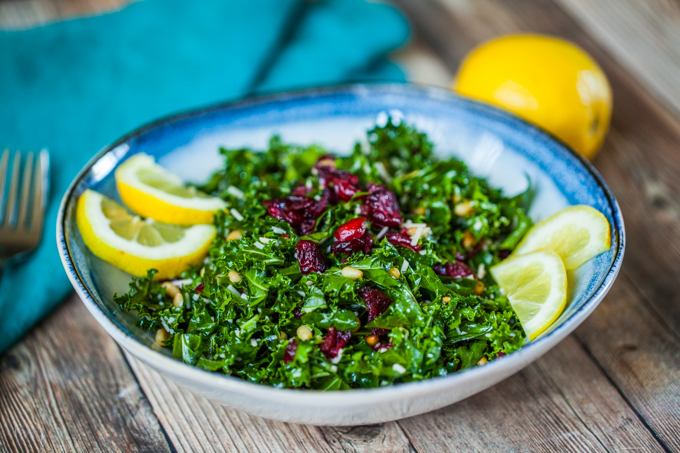 Mixed with toasted pine nuts, dried cranberries, vegan parmesan, this kale salad is a winner! It’s tossed with lemon juice and olive oil to let the flavors shine through. Throw in a pinch of red pepper flakes if you like heat and be sure to make a giant batch, you’ll definitely want seconds!