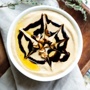 A warm, comforting vegan soup packed with flavor. Roasted sunchokes blended with cashew cream, topped with balsamic glaze and toasted hazelnuts.