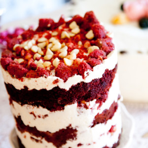 An impressive naked layer caked filled with cream cheese buttercream, red velvet cookie crumbs, macadamia nuts and rich red velvet cake. Perfect for any celebration!