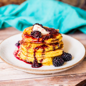 The perfect combination of sweet and savory. Vegan Buttermilk Cornbread Pancakes topped with a thick, rich blackberry syrup. Fluffy, just a bit crunchy, and oh so delicious!