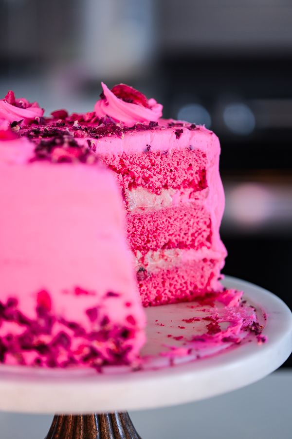 In a small bowl, combine the rose water and ½ cup evaporated oat milk. When the cake layers are cool, place the bottom layer on a cake stand or serving plate. Pour 2-3 tbsp of rose milk over the cake. Place a thin circle of frosting around the edge of the cake. Pipe or fill the center of the layer with strawberry cream. Repeat this with the second layer. Add the third layer and use the remaining frosting to cover and decorate the cake. Garnish the top with freeze dried strawberries and edible rose petals or fresh strawberries. Slice, serve, and enjoy!