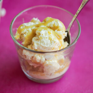 Transfer to a dish with a lid. Fold in the mango puree and sticky rice. Cover with a lid and freeze for six hours, then serve!