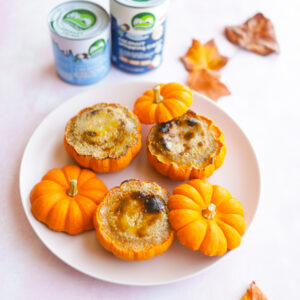 Set your oven to broil. Cover the tops of the cheesecake with 2 Tbsp sugar each in an even layer. Place the pumpkins back on the sheet pan. Broil on the top rack for 1-3 minutes or until the sugar caramelizes. Remove from the oven and let cool for 10 minutes before serving.