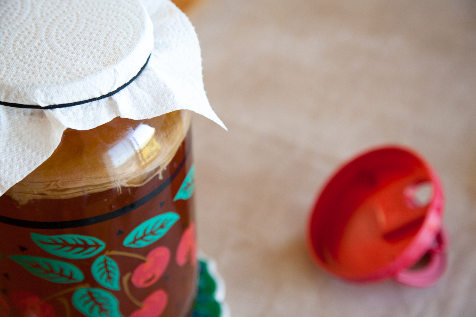 - Empty the tea into the jar. It’s ok if a little spills out. It’s quite concentrated. If the jar is not full, top it off with filtered water. You can use the lid, but make sure to leave the tab open. The fermentation process produces gas, which needs to be released. Cover the opening loosely with a piece of paper towel to prevent fruit flies from getting in. They love this stuff!!