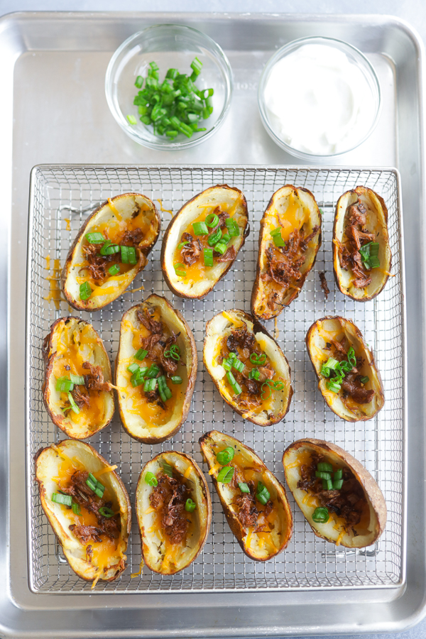 Meal prep hack: Bake and crisp the potato skins ahead of time, then stuff and melt when ready to serve.