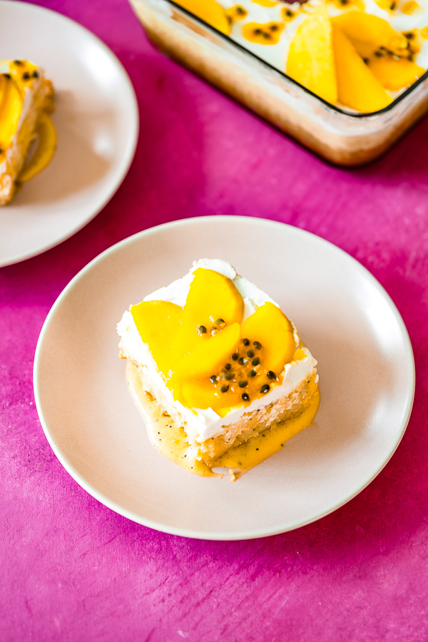 - In a chilled medium bowl, whip the coconut whipping cream until light and fluffy, about 3 minutes. When the cake is done soaking, add a thick even layer of coconut whipped cream. Top with sliced mango and passionfruit.