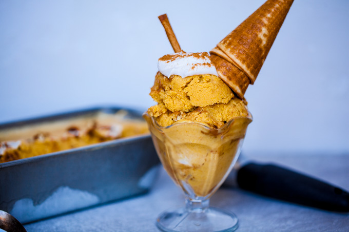 I dreamed up this easy-as-pie, Vegan Pumpkin Ice Cream recipe up one night a few weeks ago as I was drifting off to sleep. Let me tell you, half-asleep me gets it RIGHT with the flavors.