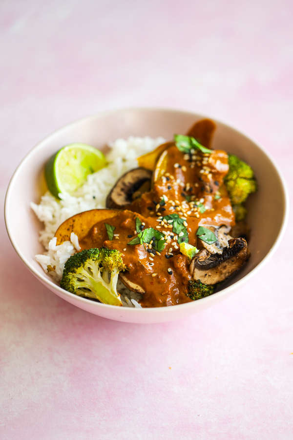 - Add the paste to a can of coconut milk over medium heat. Mix well and cook for 10 minutes or until heated through. Portion your serving bowls with rice and roasted veggies. Top with the curry mole. Garnish with chopped cilantro, sesame seeds, and a squeeze of lime.