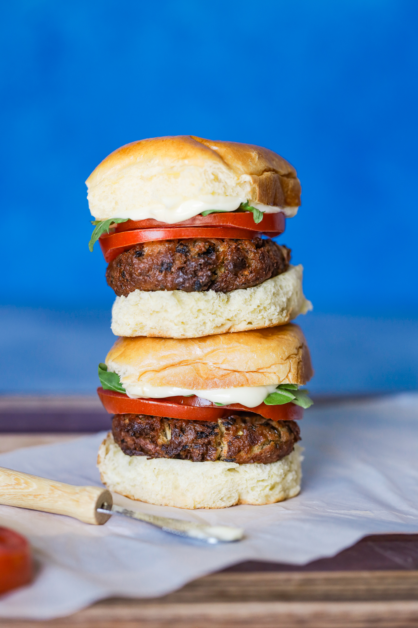 Assemble: Serve on toasted slider buns with arugula, juicy roma tomatoes, and a slather of vegan mayo.