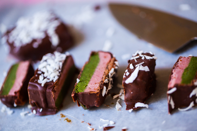 These raw vegan chocolate covered cheesecake bites are layered with strawberry and matcha for gourmet flavors from the comfort of your own kitchen. They require just ten ingredients, one appliance, and about twenty active minutes to make.
