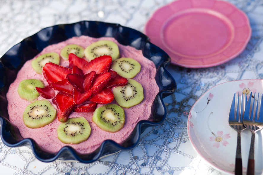 - Again in a processor or vitamix, add the strawberries, cashews, dates, and maple syrup. Blend until smooth and creamy. Layer the strawberry mixture on top of the crust. Smooth the layer out, then decorate with strawberry and kiwi slices.