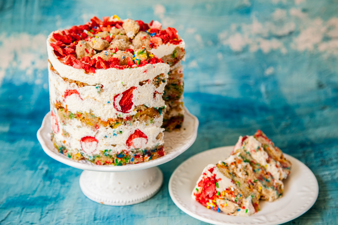 - Layer 3, The Top: Nestle the remaining cake round into the frosting. Cover the top of the cake with the last fifth of the frosting. Garnish the frosting with the remaining birthday crumbs.