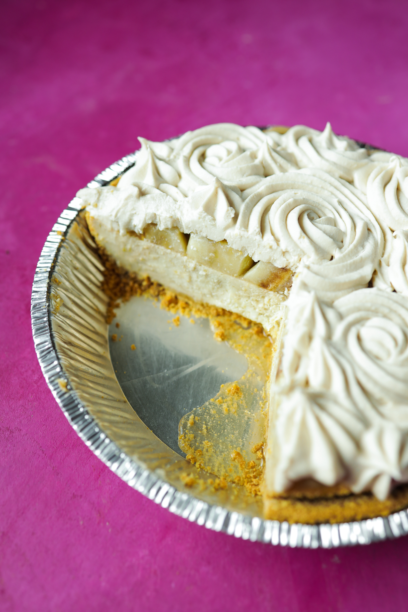 When ready to serve, layer freshly sliced bananas between the cheesecake and a cloud of whipped oat cream for a beautiful presentation and an extra burst of banana flavor in every bite!