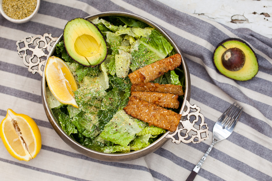 Vegan Caesar Salad with Tempeh Bacon and Hemp Seed Parmesan