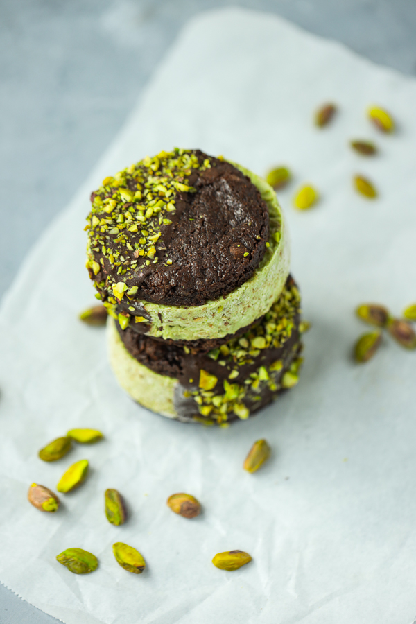 - When you’re ready to assemble, remove the pistachio ice cream from the freezer and let thaw for five minutes. Use the biscuit cutter to cut ice cream rounds. Build each sandwich with two cookies and ice cream in the middle. Press them together well then place back into the freezer to set for a few minutes,