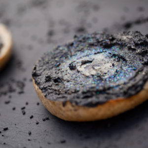 Toast your bagels. Swirl 1-2 tablespoons of Sweet Black Tahini with the same amount of Cashew Cream Cheese on top of the toasted bagel halves. Use a spoon to make a pleasing design. Finish your Vegan Galaxy Bagel off with a generous sprinkle of edible glitter and Enjoy!