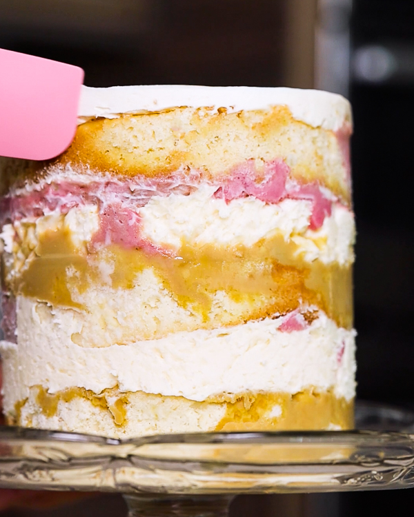- Place a cake circle on top and repeat the layers. Add the remaining cake circle and cover it with frosting. Wrap the cake in cling film and freeze overnight. to set.