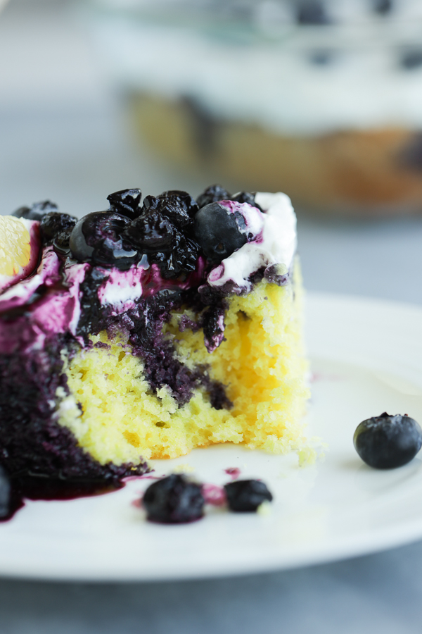 - When the cake is done, poke it all over with a chopstick or large fork. Pour the blueberry drizzle over the cake while it's still warm. Cover and chill for 4 hours or overnight to soak.