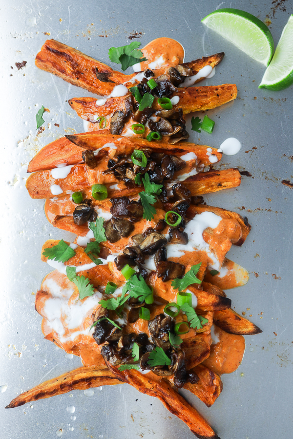 Pile the curry fries high, load them up with mushrooms, drizzle that coconut yogurt like a boss, and shower the whole thing in fresh cilantro, green onion, and lime juice. It’s giving flavor. It’s giving texture. It’s giving please don’t make me share.