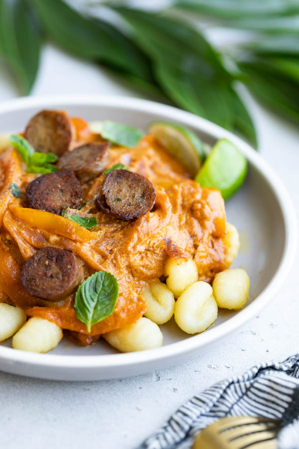 Welcome to my new series, Vegan Pantry Meals! Today’s feature is a 20-minute meal that’s perfect for busy weeknights when you want to whip up something nutritious and tasty using mostly pantry ingredients. This Panang Curry with Pan-Fried Gnocchi and Vegan Sausage recipe is a delightful fusion of flavors. This meal will quickly become a family favorite, proving that weeknight meals can be both easy and satisfying.