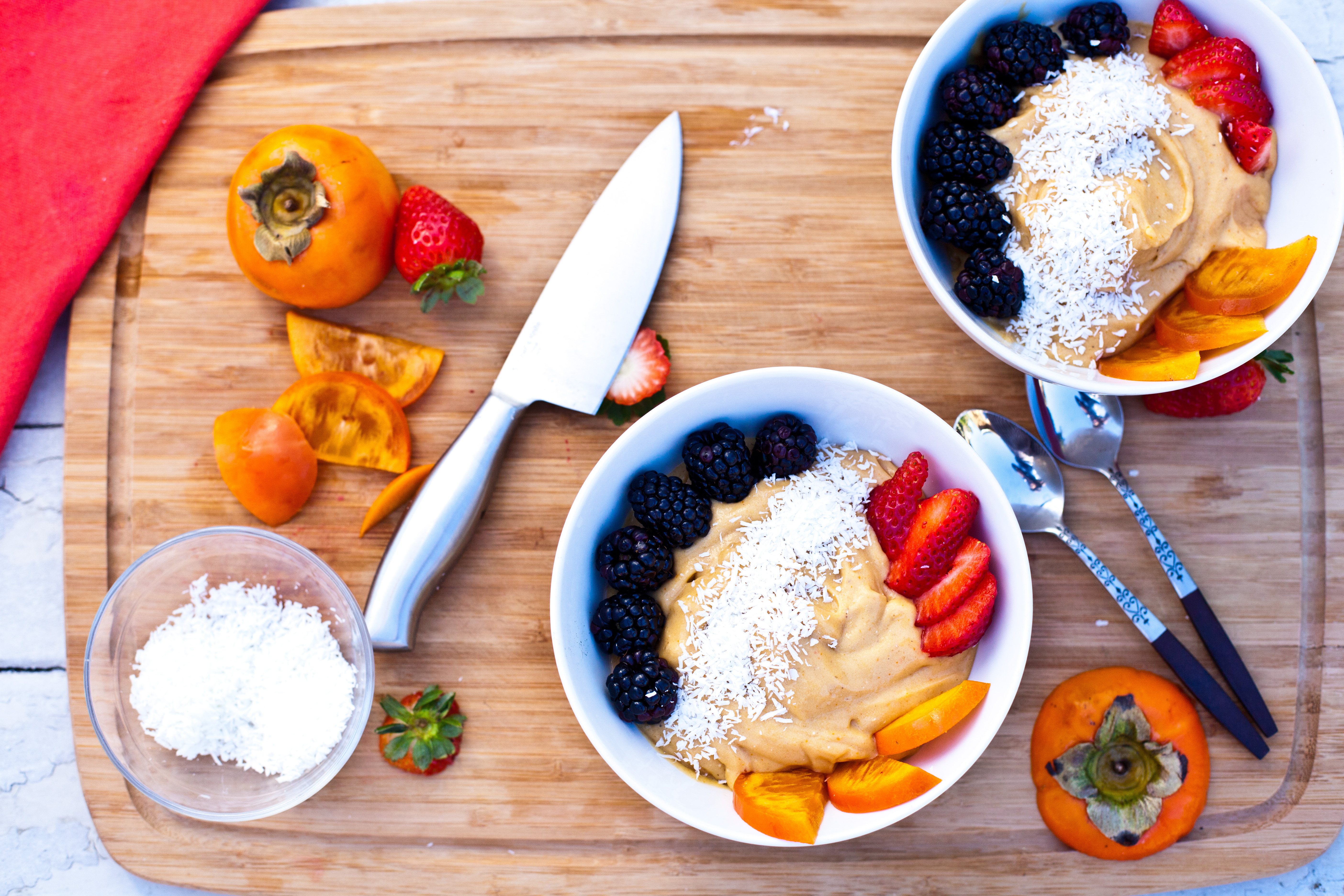 - Pour the vegan ice cream into a bowl and top with anything you like! Strawberries, extra persimmon slices, blueberries, blackberries, shredded coconut, pineapple, the possibilities are endless!