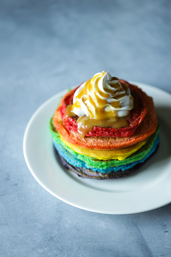 - Stack your gorgeous rainbow pancakes, top with whipped coconut cream, salted caramel sauce and enjoy!