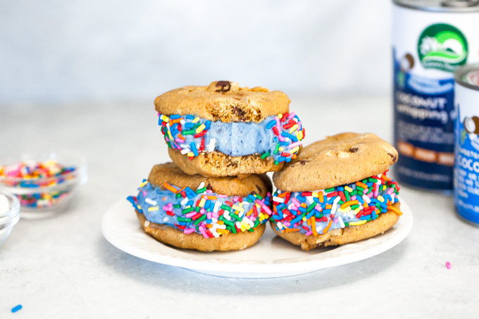 I teamed up with my friends at Nature’s Charm to bring you this simple, easy recipe! I used their sweetened condensed coconut milk and coconut whipping cream with just a handful of other ingredients to make these amazing vegan smurf ice cream sandwiches. They taste like a cloud and a rainbow had a marshmallow baby!