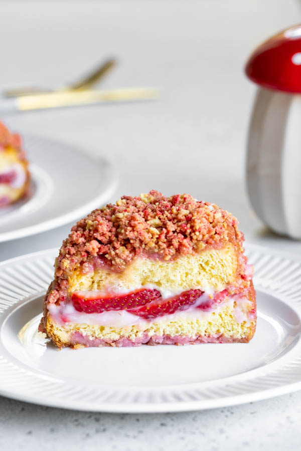The creamy center is a sweet combination of vegan cream cheese, maple syrup, and fresh strawberries. This is sandwiched between slices of vegan brioche that have been soaked in a colorful bath of coconut milk, aquafaba, dragonfruit powder, chickpea flour, strawberry jelly, and vanilla.