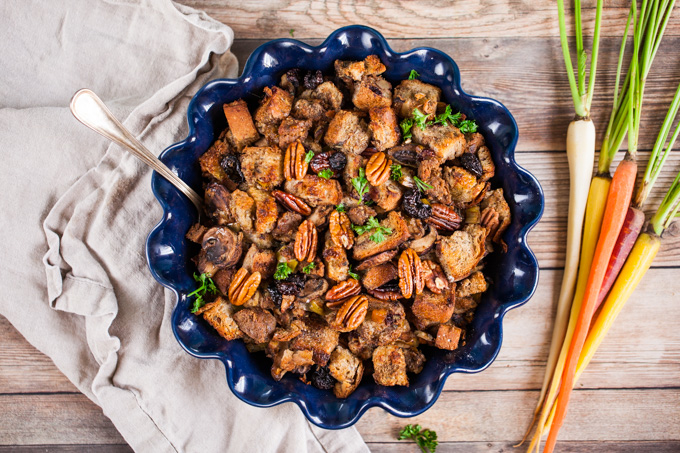 I’m a big fan of sweet and savory things, so to liven up the flavors in this unbelievable vegan stuffing I tossed in some chopped dried cherries. Who says cranberries get to have all the fun?