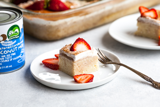 I teamed up with my dear friends at Nature’s Charm to bring this incredible vegan tres leches cake to you! The star ingredient is Nature’s Charm sweetened condensed coconut milk. It is SO good. Thick, sweet, creamy, and absolutely addictive!