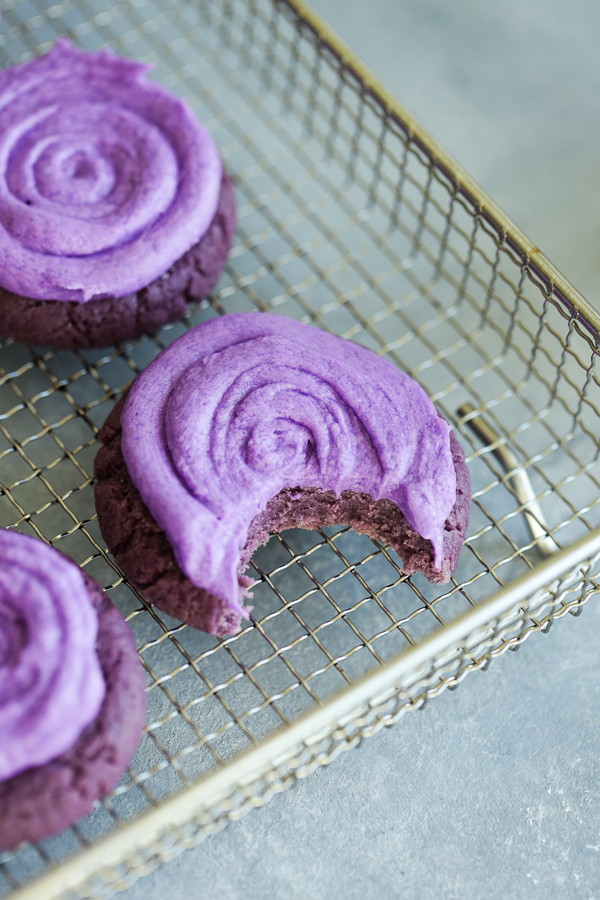 The ube jam swirled into the dough brings concentrated flavor and that iconic purple hue, while the whipped coconut-based frosting takes these cookies firmly into dessert-table territory.